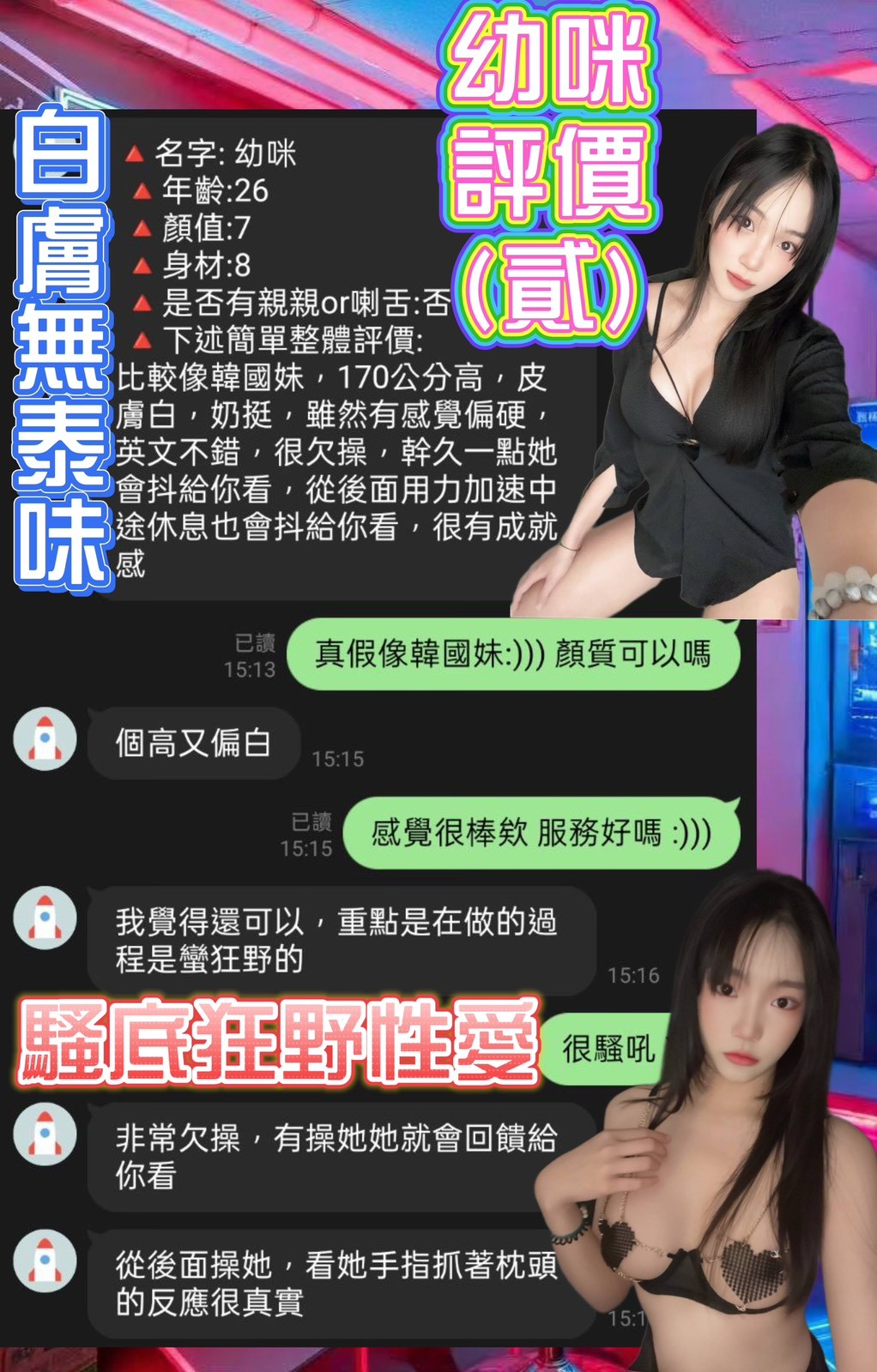 項目:無套吹/戴套做/殘廢澡/品鮑/69/奶炮/情趣按摩/舌吻(吃檳榔者不可)