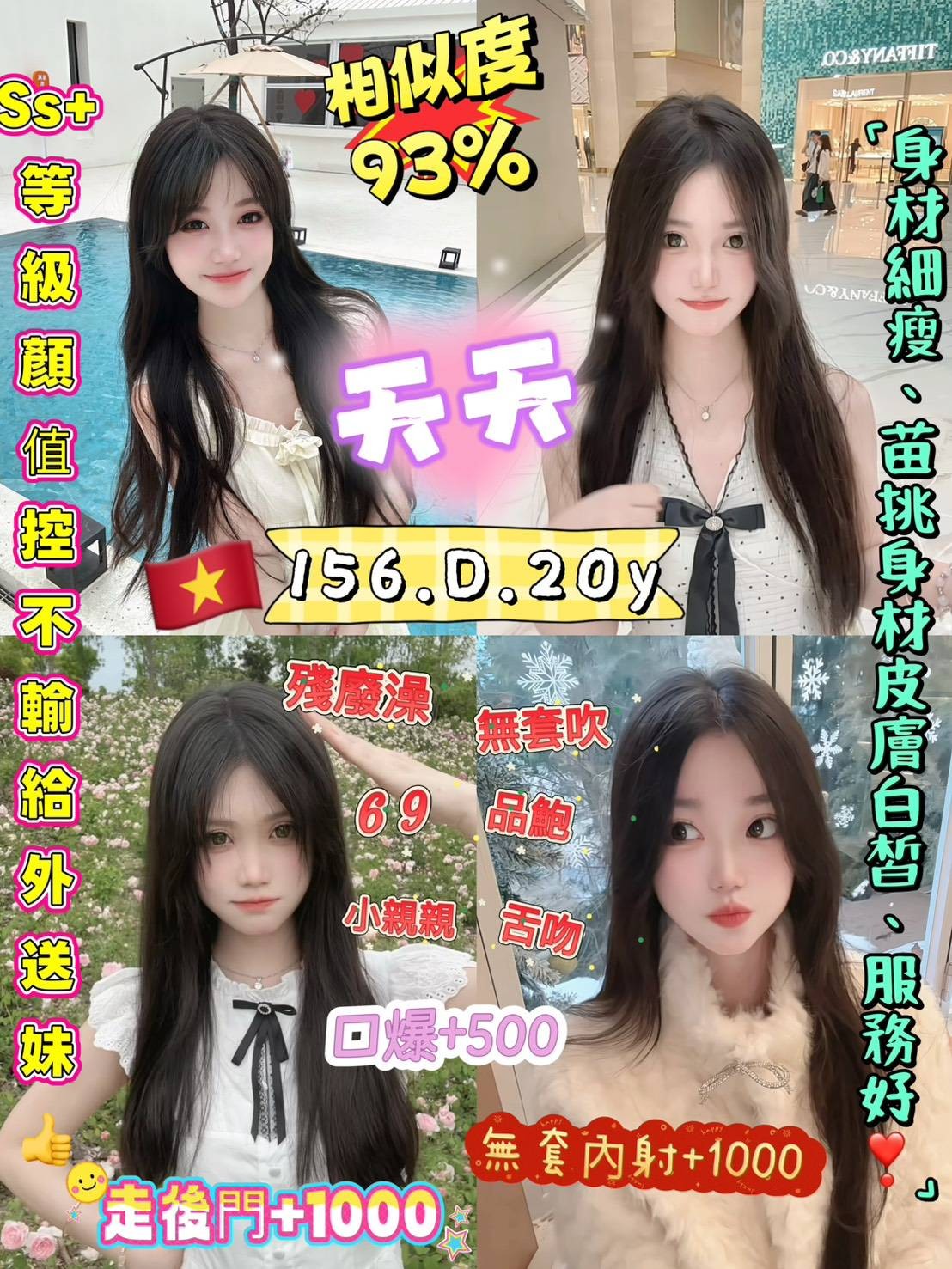 舌吻/無套吹/奶炮/69/品鮑/殘廢澡/按摩/無套+2000/顏射+500